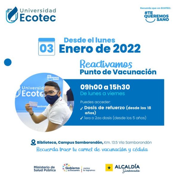 La Universidad Ecotec reactivó los puntos de vacunación en su campus Samborondón y continúa con el objetivo de que más samborondeños puedan reforzar y cumplan con su esquema completo contra la COVID-19.