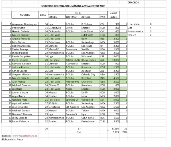Me concentro en los últimos 7 años y tomando en consideración que el promedio de edad de la selección es de 26 años (Cuadro 1), analizaré al equipo. De los 28 integrantes, 18 se iniciaron a los 19 años y hoy representan a nuestro país en la selección. De esos 18, 8 fueron formados por el I del Valle, es decir el 44% de la sangre nueva es del Independiente del Valle, personas no solo futbolistas. Ésta es nuestra selección actual. Éste equipo tiene formación integral, tiene destrezas, juegan en el extranjero, 21 de los 28, son competitivos y aman a su país.