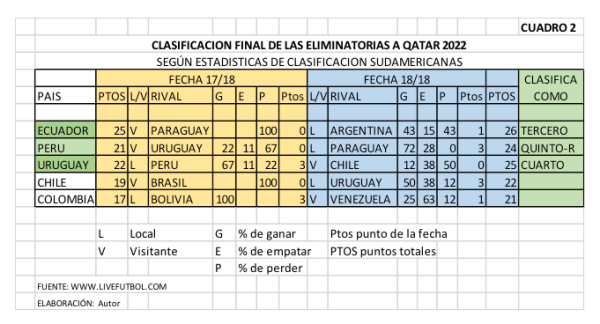 Por ello, basado en las estadísticas y en el análisis previo, creo que clasificamos directamente, pues con un solo punto adicional, empate con Argentina, entramos al Qatar 2022. Quedaríamos terceros. Algunos sabios y duchos del fútbol coinciden en que en el fútbol no hay reglas sino lo bello de este deporte es que todo puede cambiar en un minuto. Sin embargo, según el desempeño de las 10 selecciones sudamericanas y sus resultados en las pasadas eliminatorias, Ecuador tiene una alta probabilidad de clasificar como tercero (Cuadro 2).