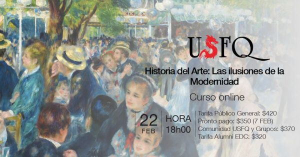 La Universidad San Francisco de Quito el martes 22 de febrero a las 23:00 presenta el webinar: Historia del Arte: Las Ilusiones de la Modernidad Explora el arte europeo de la segunda mitad del siglo XIX, a través de parámetros estilísticos y teóricos, información historia y cuestionamiento crítico del mismo.