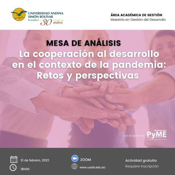 Este lunes 21 de febrero de 2022 se presenta la mesa de análisis: “La cooperación al desarrollo en el contexto de la pandemia: Retos y perspectivas” en cooperación al desarrollo, en el contexto de la pandemia: Inscríbete.