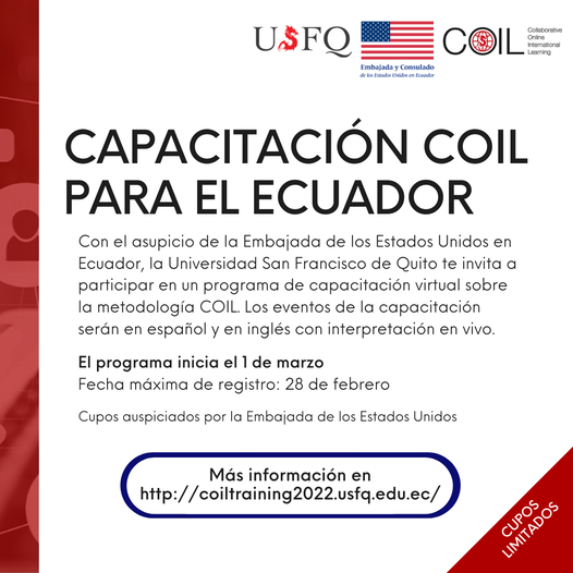La Universidad San Francisco de Quito, con el auspicio de la Embajada de los Estados Unidos, te invita a ser partícipe de un programa de capacitación totalmente virtual y de alto impacto sobre la metodología COIL (Collaborative Online International Learning) para profesores y coordinadores a nivel nacional.