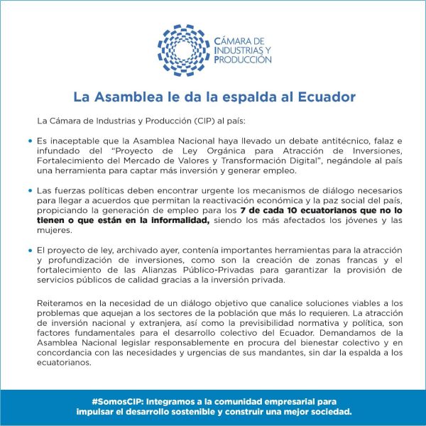 “Reiteramos en la necesidad de un diálogo objetivo que canalice soluciones viables a los problemas que aquejan a los sectores de la población que más lo requieren. La atracción de inversión nacional y extranjera, así como la previsibilidad normativa y política, son factores fundamentales para el desarrollo colectivo del Ecuador. Demandamos de la Asamblea Nacional legislar responsablemente en procura del bienestar colectivo y en concordancia con las necesidades y urgencias de sus mandantes, sin dar la espalda a los ecuatorianos”, finaliza la CIP.