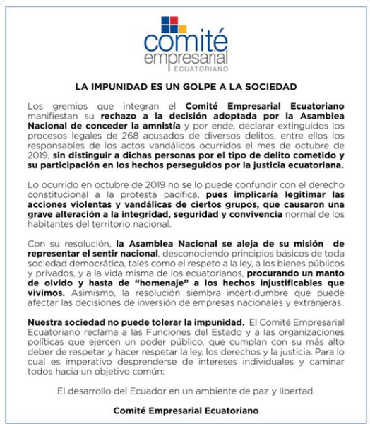 Desde diversos sectores han rechazado la actuación de la Asamblea. Aquí el pronunciamiento de los gremios que integran el Comité Empresarial Ecuatoriano.