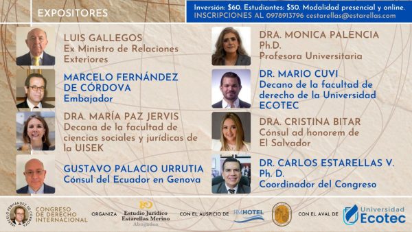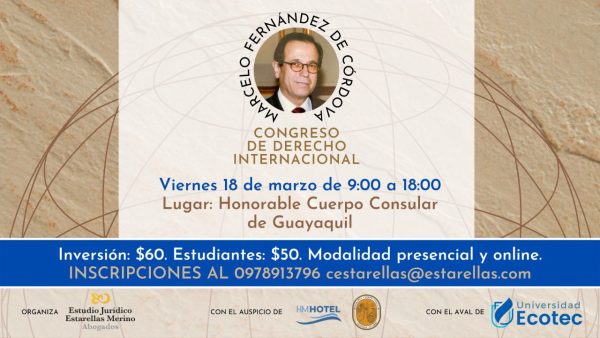 Este 18 de marzo se llevará a cabo el Congreso de Derecho Internacional Marcelo Fernández de Córdoba, evento, organizado por el Estudio Jurídico Estarellas Merino con el aval de la Universidad Ecotec.