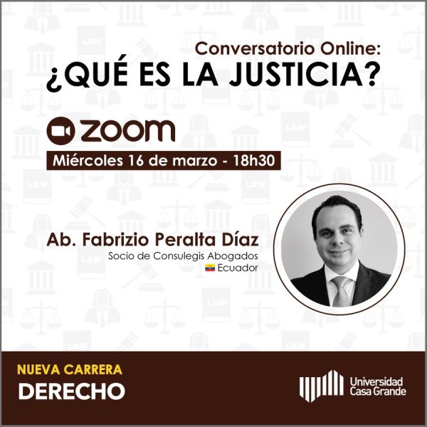 La Universidad Casa Grande realizará el miércoles 16 de marzo, a las 18:30, un conversatorio online denominado ¿Qué es la justicia?, que estará a cargo de Fabrizio Peralta Díaz, con amplia experiencia en Derecho Corporativo; tiene un máster en Informática y Derecho por la Universidad Complutense de Madrid.
