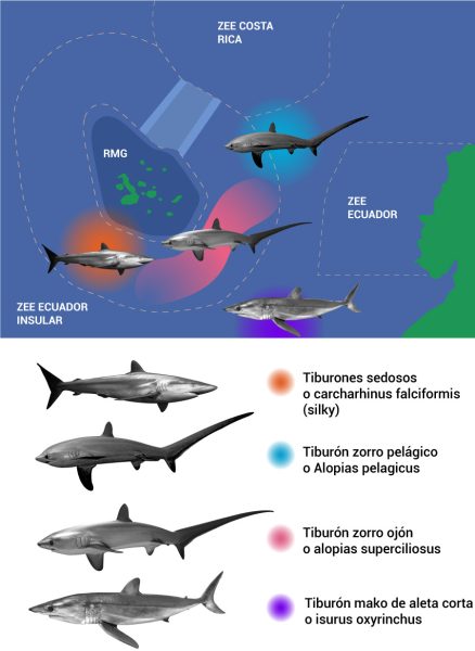 Se trata del tiburón zorro pelágico (Alopias pelagicus) y el tiburón mako de aleta corta (Isurus oxyrinchus), considerados En Peligro por la Unión Internacional para la Conservación de la Naturaleza (UICN) y del tiburón sedoso (Carcharhinus falciformis) y el tiburón zorro ojón (Alopias superciliosus) ambos en la categoría de Vulnerable.