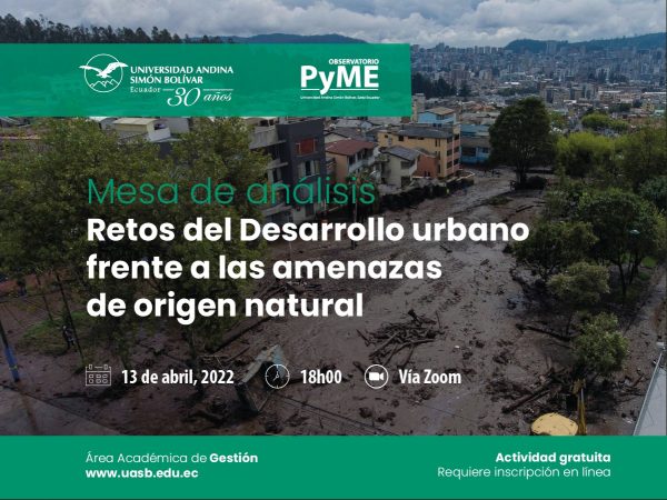 La Universidad Andina Simón Bolívar este 13 de abril ejecutará una mesa de análisis “Retos del desarrollo urbano frente a las amenazas de origen natural”. Los desastres que vienen ocurriendo en el país en estos dos últimos años serán evaluados desde el ámbito académico, político y técnico. La actividad se realizará a las 18:00 a través de Zoom.