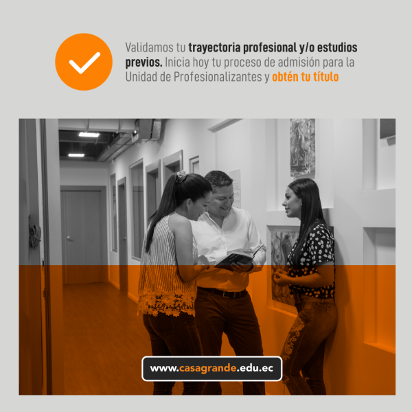 La Universidad Casa Grande tiene las admisiones abiertas. Los interesados pueden validar los años de experiencia laboral y obtener su licenciatura. Actúa hoy el proceso de admisión para la Unidad de profesionalizantes.