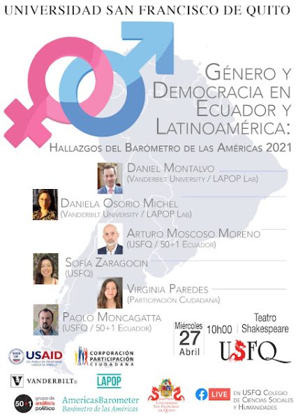 Varios expositores presentan algunos de los hallazgos más relevantes del Barómetro de las Américas 2021, las encuestas realizadas bianualmente por el LAPOP (Latin American Public Opinion Project). En esta ocasión el evento tendrá como eje central a la intersección entre género y democracia, pero también se discutirán hallazgos relacionados con preferencias sobre el sistema político de los ecuatorianos y sobre el efecto que ha tenido la pandemia COVID-19 en las actitudes políticas en el Ecuador. El evento se presta como una excelente oportunidad para conocer detalles recientes sobre la cultura política de los ecuatorianos.