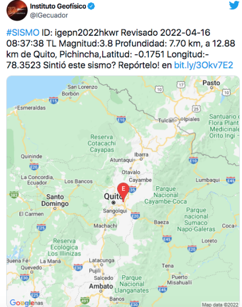 Un sismo se registró en Quito el 16 de abril de 2022. Usuarios reportan que el movimiento telúrico se registró en Pomasqui y en el sector de La Mariscal, en el norte de la capital. El Instituto Geofísico de la Escuela Politécnica Nacional informó que el temblor fue de magnitud 3.8 con una profundidad de 7.70 km, a 12.88 km de la capital.