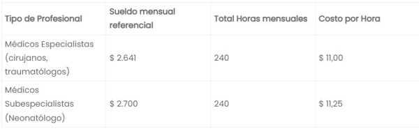 Mientras que los honorarios médicos correspondientes para visitas como interconsultas, cuidados subsecuentes, visitas en emergencia, etc., los valores se han establecido tomando en cuenta el sueldo referencial de un médico especialista o subespecialista, el mismo que se divide por las 240 horas mensuales y se determina el costo por hora.