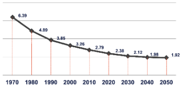 • Disminución de la tasa de natalidad (ver Gráfico No. 1: actualmente alrededor de 2,38 hijos por mujer, descendiendo regularmente).