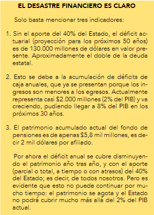 • Administración poco técnica, influenciada por de-cisiones políticas, que se agravaron con la eliminación temporal del 40% por parte del Estado y la adopción de la Resolución CD 501 (se trasladó una parte de los aportes por jubilación a salud) que, con justificaciones absurdas, aceleró la des-capitalización del fondo de pensiones.