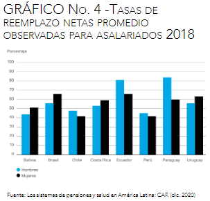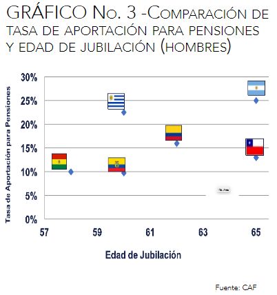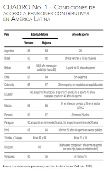 Además, en el cuadro No.1 se aprecia una comparativa regional de los sistemas de pensiones en América Latina que complementa el gráfico No. 3, en el que podemos ver las diferentes edades mínimas para acceder a la jubilación en el informe “Los sistemas de pensiones y salud en América Latina: los desafíos del envejecimiento, el cambio tecno-lógico y la informalidad” de diciembre 2020 publicado por la CAF.