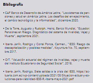 El sistema ecuatoriano de seguridad social está en crisis y constituye, sin duda, una preocupación constante en la población. Efectivamente, en la coyuntura actual de crisis económica y falta de empleo, el Ecuador re-quiere realizar reformas laborales y cambios en el sistema de seguridad social, buscando una modificación de su estructura, que corrija graves desfases presen-tes y futuros; y permita que los trabajadores tengan la confianza de recibir una pensión adecuada, que, de manera oportuna y transparente, refleje la aportación y evolución de su trabajo en el tiempo.