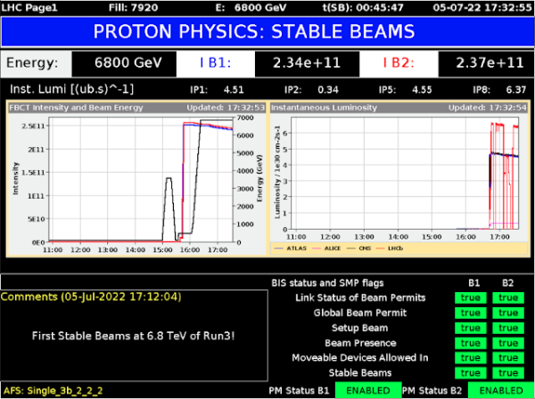 Esta vez, la máquina alcanzó la energía mundial récord de 13.6 billones de electronvoltios (13.6 TeV). Estas colisiones de alta energía con haces estables marcarán el comienzo de la tercera corrida del LHC, llamada Corrida 3.
