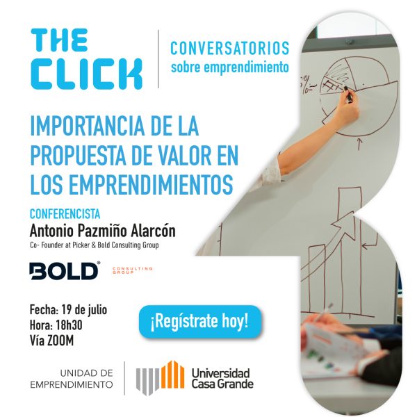 La Unidad de Emprendimiento de la Universidad Casa Grande invita a toda la comunidad de emprendedores guayaquileños a una nueva sesión de The Click. Esta vez se hablará de la “Importancia de la propuesta de valor en los emprendimientos” a través de la conferencia de Antonio Pazmiño Alarcón, Co- Founder at Picker & Bold Consulting Group.