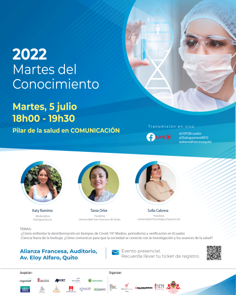 Es necesario reconstruir los pilares de la salud para fortalecer el avance y el progreso de un país. Comparte con nosotros los Martes del Conocimiento. Este 5 de julio se abordarán temas sobre ¿Cómo enfrentar la desinformación en tiempos de Covid-19? Medios, periodismo y verificación en Ecuador junto a Tania Orbe de la USFQ y Sofía Cabrera de la UTE con el tema Ciencia fuera de la burbuja: ¿Cómo comunicar para que la sociedad se conecte con la investigación y los avances de la salud?