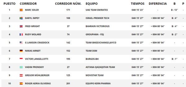 A 25 kilómetros de la meta, la fuga estaba conformada por siete ciclistas, cuatro de ellos españoles, Soler entre ellos. En ese grupo estaba también el ecuatoriano Jonathan Caicedo, que fue uno de los protagonistas del día.