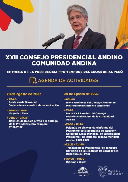 Durante la Cumbre presidencial andina el gobernante ecuatoriano ofrecerá un informe sobre su gestión en la conducción del grupo entre 2021 y 2022, que será su última actividad como líder temporal del organismo de integración.