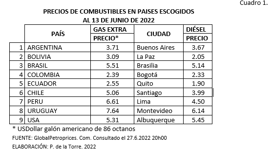 Para el mes de junio de 2022 los precios de la gasolina extra y del diésel cambiaron, manteniendo la tendencia, (Cuadro 1). La gasolina se toma como indicador en el país y el diésel en la ciudad más importante. Colombia registra el precio de gasolina más barato, USD 2.39, ligeramente inferior al precio de Ecuador, USD 2.55. Para el caso del diésel en la ciudad de Quito-Ecuador se registra el precio más bajo USD 1.90. ¿Existe fundamento para focalizar los precios de los combustibles? No, creo que no.