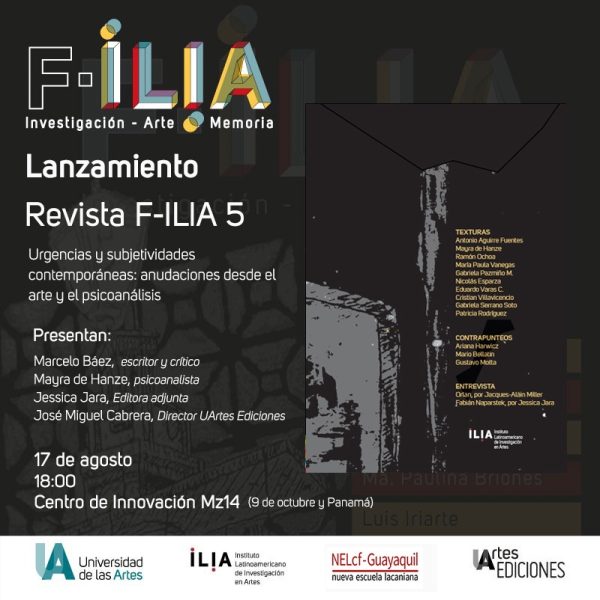Quedan invitados a descargar la FILIA-5: http://ilia.uartes.edu.ec/ilia/publicaciones/f-ilia/, y a acompañarnos el miércoles 17 de agosto a las 18:00 al lanzamiento esta original revista en el Centro de Innovación MZ 14 (9 de Octubre y Panamá) de la Universidad de las Artes del Ecuador. Próximamente anunciaremos la presentación de la F-ILIA 5 en Quito.