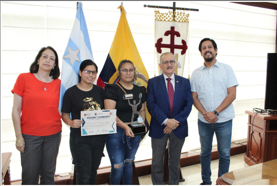 Las estudiantes Johanna Baque Maldonado y Noemí Torres Herrera alumnas del primer ciclo de la carrera de Diseño Gráfico, de la Facultad de Arquitectura y Diseño de la Universidad Católica de Santiago de Guayaquil recibieron en representación de sus compañeros el premio CANstruction ganado por la UCSG en la categoría mejor escultura.