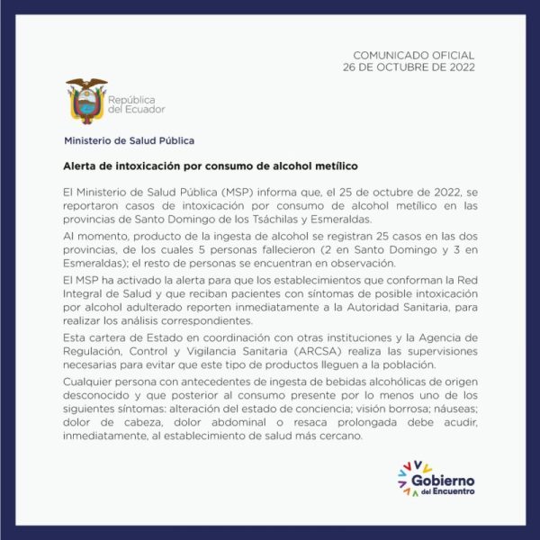 La Agencia Nacional de Regulación, Control y Vigilancia Sanitaria (Arcsa) explicó que el alcohol metílico es absorbido directamente por el hígado, donde sufre agresivos procesos de oxidación y podría producir intoxicación, convulsiones e incluso la muerte. De acuerdo con la institución, el uso del metanol en la elaboración de bebidas alcohólicas se popularizó a partir del 2008 cuando se promulgó una ley que le eximía del IVA.