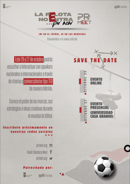 El PR Meet está de vuelta, en su quinta edición “La Pelota No Entra Por Azar” con el tema “Pasión por el Mundial” y donde contaremos, por segundo año consecutivo, con la agencia de publicidad Paradais DDB como partner estratégico. Esta nueva edición busca conectar con personas inmersas en el mundo deportivo, además, podrán conocer de qué manera las marcas han trabajado la comunicación y cómo han logrado posicionarse de forma estratégica entre la audiencia futbolística, desde el concepto de la Copa Mundial de la FIFA Qatar 2022.