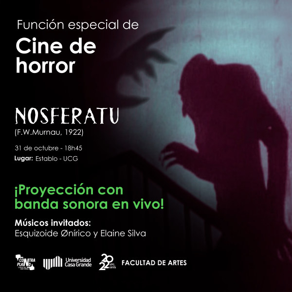 La Universidad Casa Grande presentará este lunes 31 de octubre una función especial de terror con banda sonora en vivo, se trata de la película Nosferatu (Murnau, 1922).
