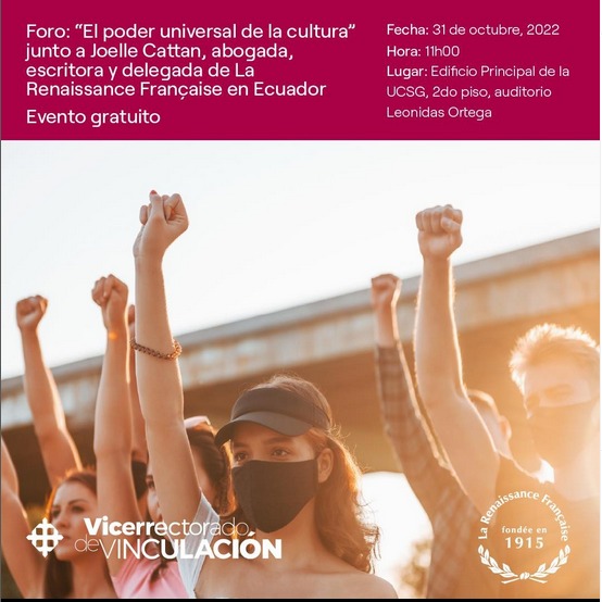 A través de este foro, la abogada franco-libanesa, Joelle Cattan, reflexionará sobre cómo la cultura puede convertirse en un vector de desarrollo sostenible para revertir situaciones como las que vivimos en la actualidad. Una época sumamente difícil en que la violencia, la criminalidad y el narcotráfico están contaminando nuestros entornos. Además, se conversará sobre de qué manera la cultura se convierte en una forma de resistencia ante las divisiones de la sociedad. ✊
