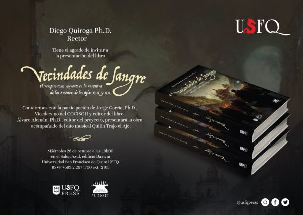 Vecindades de sangre. El vampiro como migrante en la narrativa de las Américas de los siglos XIX y XX será presentado el miércoles 26 de octubre a las 19:00, en el Salón Azul, que está ubicado en el edificio Darwin, ubicado en el campus de la Universidad San Francisco de Quito USFQ (Cumbayá).