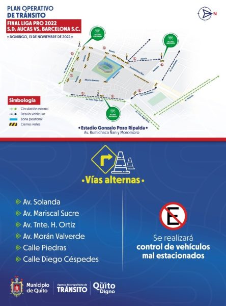 La final de la LigaPro entre Aucas y Barcelona, que se desarrollará el domingo 13 de noviembre desde las 18:00, causará varios cierres viales en la capital; además habrán operativos de movilidad permanentes desde el sábado.