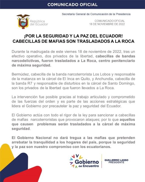“Les dijimos que no nos temblaría la mano, y que habría consecuencias para quien pretendiera crear caos. Que las mafias y cabecillas no se confundan: este será el mismo destino a quienes continúen con sus intentos de quebrar la paz de los ecuatorianos”, señaló Lasso.