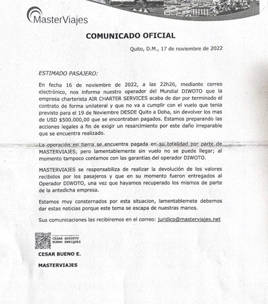 Todo iba bien y los hinchas se preparaban para partir el sábado 19 de noviembre desde Quito hasta Doha, capital de Catar. No obstante, la agencia dejó de contestar las llamadas de los usuarios y el jueves, 17 de noviembre, emitió un comunicado a sus clientes con la noticia de la cancelación del viaje.