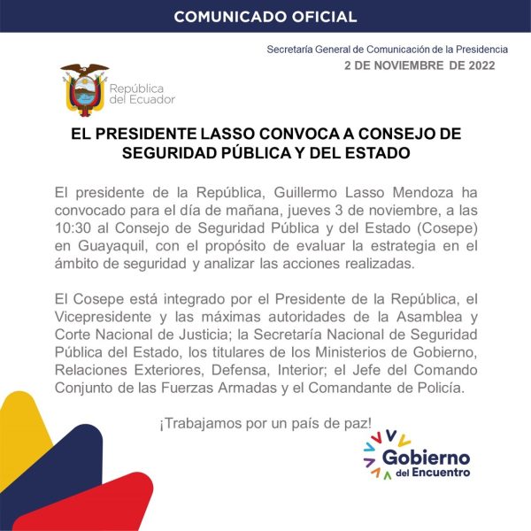 El presidente de la República, Guillermo Lasso Mendoza ha convocado para el día de mañana, jueves 3 de noviembre, a las 10:30 al Consejo de Seguridad Pública y del Estado (Cosepe) en Guayaquil, con el propósito de evaluar la estrategia en el ámbito de seguridad y analizar las acciones realizadas.