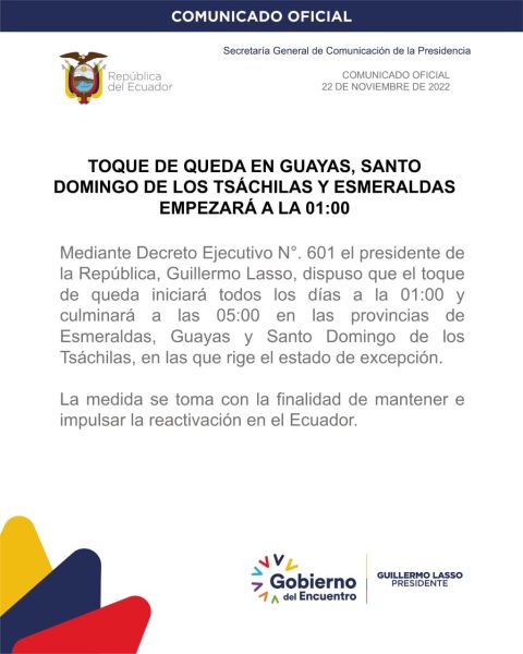 A partir de este 23 de noviembre de 2022, el toque de queda se iniciará a las 01:00 y terminará a las 05:00, así todos los días de la semana. Lasso anunció que habrá “rígidos controles para salvaguardar la seguridad de todos”.