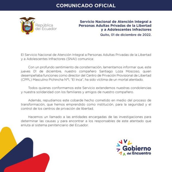 El Servicio Nacional de Atención Integral a Personas Adultas Privadas de la Libertad (SNAI) emitió un comunicado lamentando lo ocurrido con el director de dicho centro de privación de libertad. “Hacemos un llamado a las entidades encargadas de las investigaciones para determinar las causas y para encontrar a los responsables de este atentado que enluta al sistema penitenciario del Ecuador”, manifiesta el documento.