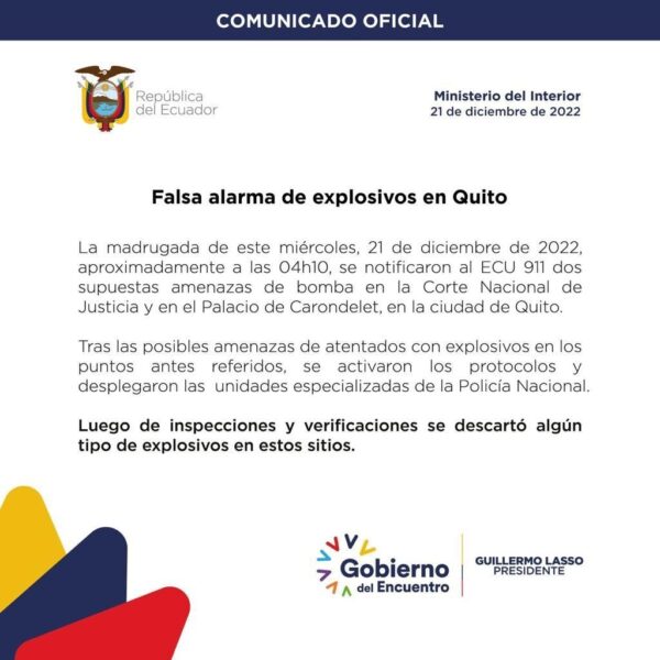 “Tras las posibles amenazas de atentados con explosivos en los puntos referidos (Palacio de Carondelet y Corte de Justicia), se activaron los protocolos”, detalla la institución.