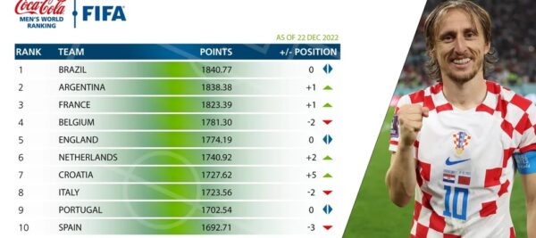 Brasil, a pesar de caer en cuartos de final de la Copa del Mundo frente a Croacia en la tanda de penales, se mantiene como líder del ránking FIFA, aunque ahora es seguida de cerca por su histórico rival, la Albiceleste, que subió hasta la segunda posición, antes ocupado por Bélgica.