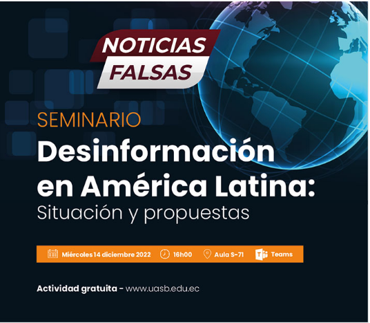El Área de Comunicación de la Universidad Andina Simón Bolívar, Sede Ecuador invita al seminario “Desinformación en América Latina: situación y propuestas”.