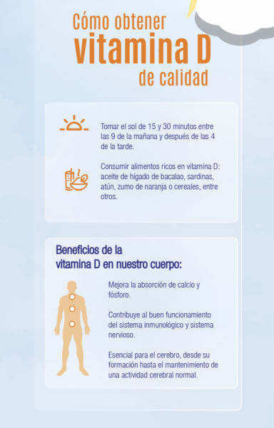 La vitamina D se sintetiza en la piel gracias al sol, por eso se la conoce comúnmente como “la vitamina del sol”, y se activa a través de un proceso denominado hidroxilación que se lleva a cabo en el hígado y los riñones. La vitamina D adquirida por la piel contribuye al 90% del requerimiento de esta vitamina, aunque no debemos desdeñar la importancia de complementar con alimentos ricos en vitamina D como el aceite de hígado de bacalao, sardinas, atún, zumo de naranja o cereales, entre otros. El receptor de la vitamina D está presente en la gran mayoría de los tejidos y células, es por eso que tiene un papel importante en todo el organismo.