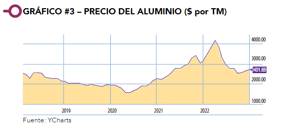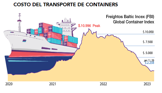 Uno de los elementos claves en este contexto, es que productos como los alimentos, el aluminio y transporte de containers (ver gráfico #2 y #3) y muchos otros, han tenido un reajuste importante a la baja desde su máximo de finales 2021 y el primer trimestre 2022, aunque en general están aún un 20%/40% por encima de su nivel del 2019 antes de la pandemia. Y por ahí parecen estabilizarse. Aunque en el sentido contrario, es sensato esperar que otros productos, por ejemplo el petróleo tenga un ajuste al alza e incluso algún momento en 2023 vuelva hacia niveles alrededor de los 100 dólares por barril.