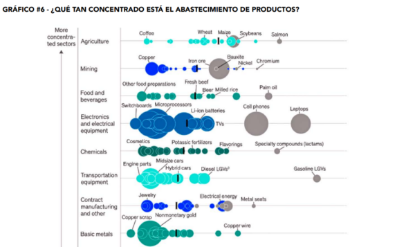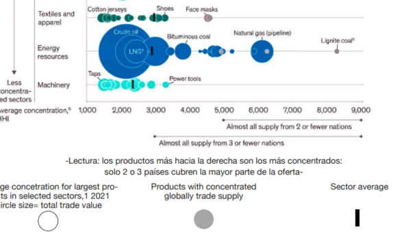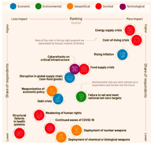 Por otro lado, según el World Economic Forum (gráfico #5), estos son los temas que las encuestas revelan como los más peligrosos. Vemos que el cuadrante superior derecho es el más delicado (mayor preocupación y mayor impacto). Crisis energética, inflación, cyberataques, problemas en las cadenas de suministro.