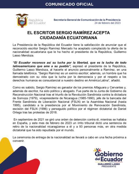 El escritor Sergio Ramírez Mercado, nicaragüense de nacimiento, aceptó la ciudadanía ecuatoriana ofrecida por el presidente, Guillermo Lasso, anunció el Gobierno este viernes 24 de febrero del 2023.