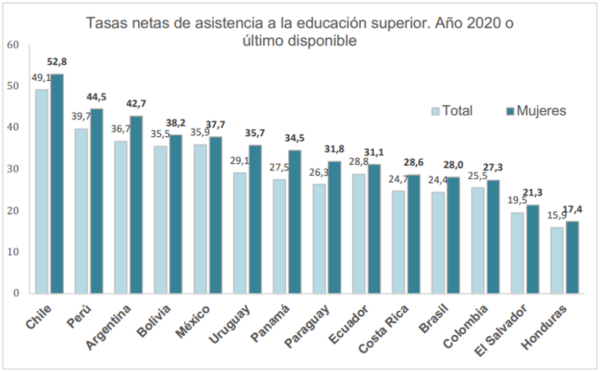 Por otro lado, el informe advierte de la gran disparidad que existe entre los países de la región en cuanto al acceso de las mujeres a la educación superior —gran condicionante para el posterior acceso a la carrera científica—, en donde en Chile, por ejemplo, el 53% de la población femenina accede a carreras de educación superior, mientras que en Honduras tan solo el 17% de la población femenina lo hace.