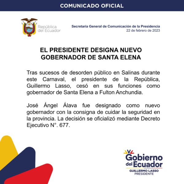 La decisión del Primer Mandatario, según el escrito, se debe a los sucesos de desorden público registrados en Salinas durante el feriado de Carnaval tras cesar en funciones al anterior Gobernador, Fulton Anchundia. La designación se oficializó mediante el Decreto Ejecutivo N° 677.