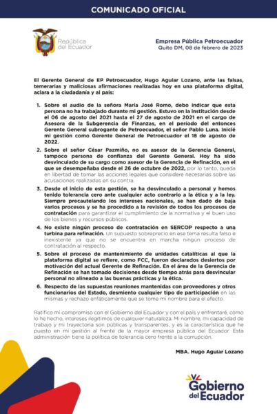 Sobre este tema, Petroecuador emitió un comunicado el 8 de febrero de 2023 en el que se detalló que María José Romo laboró en la institución del 6 de agosto de 2021 al 27 de agosto de 2021, en el cargo de Asesora de la Subgerencia de Finanzas, durante la gerencia de Pablo Luna.