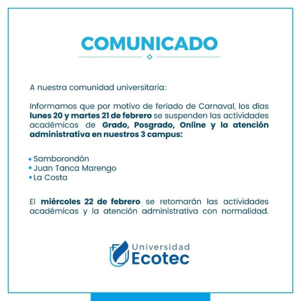 Mucho ojo con esta información de la Universidad Ecotec. Por motivo de feriado de Carnaval, los días